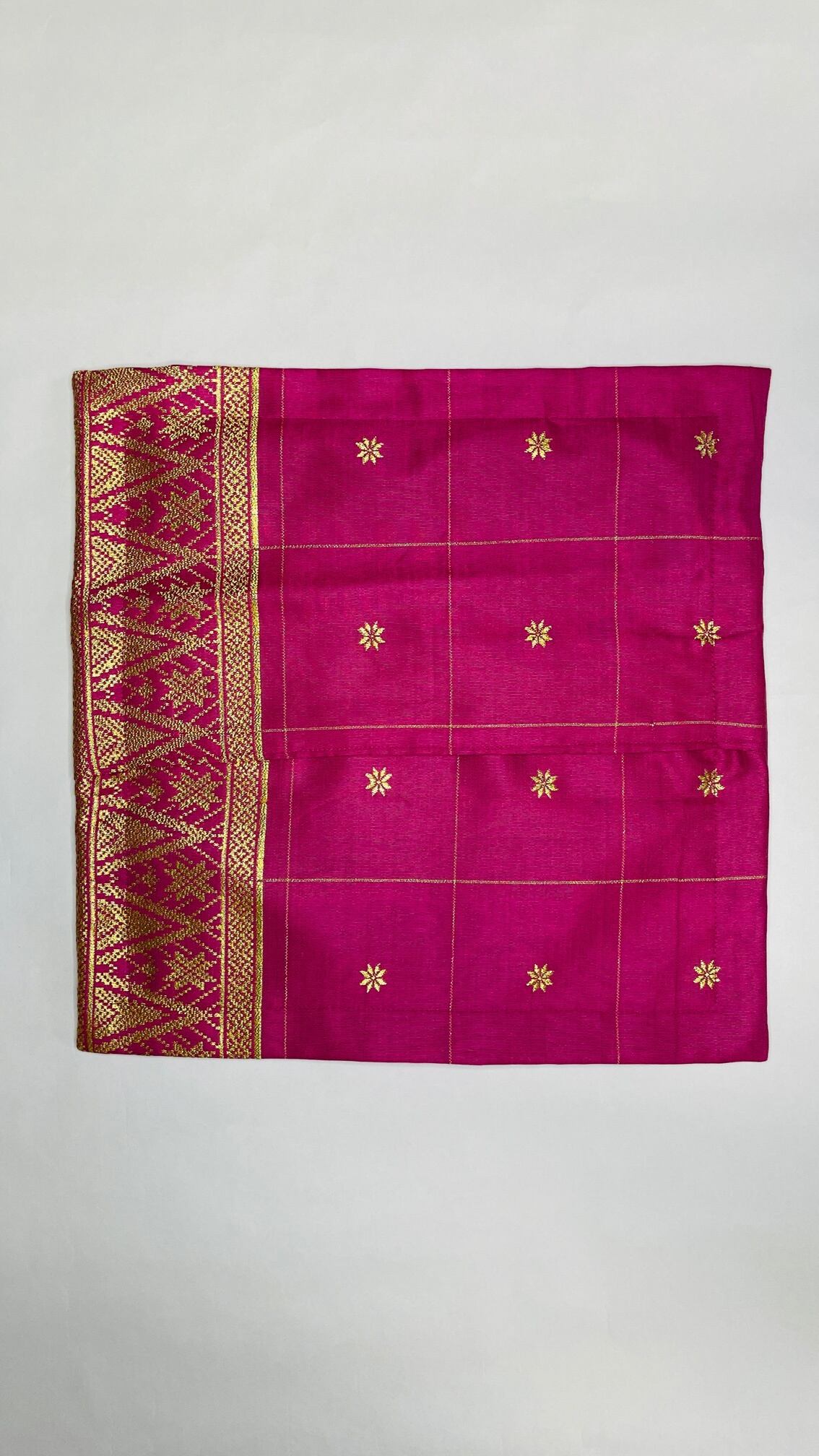 ブルネイ機械織の生地で製作したオリジナルクッションカバーです。鮮やかなピンク色の生地に織り込まれた金糸のブルネイフラワーデザイン柄のクッションは、お部屋のインテリア小物としてもおしゃれでかわいいです。出し入れが簡単なので使いやすいです。