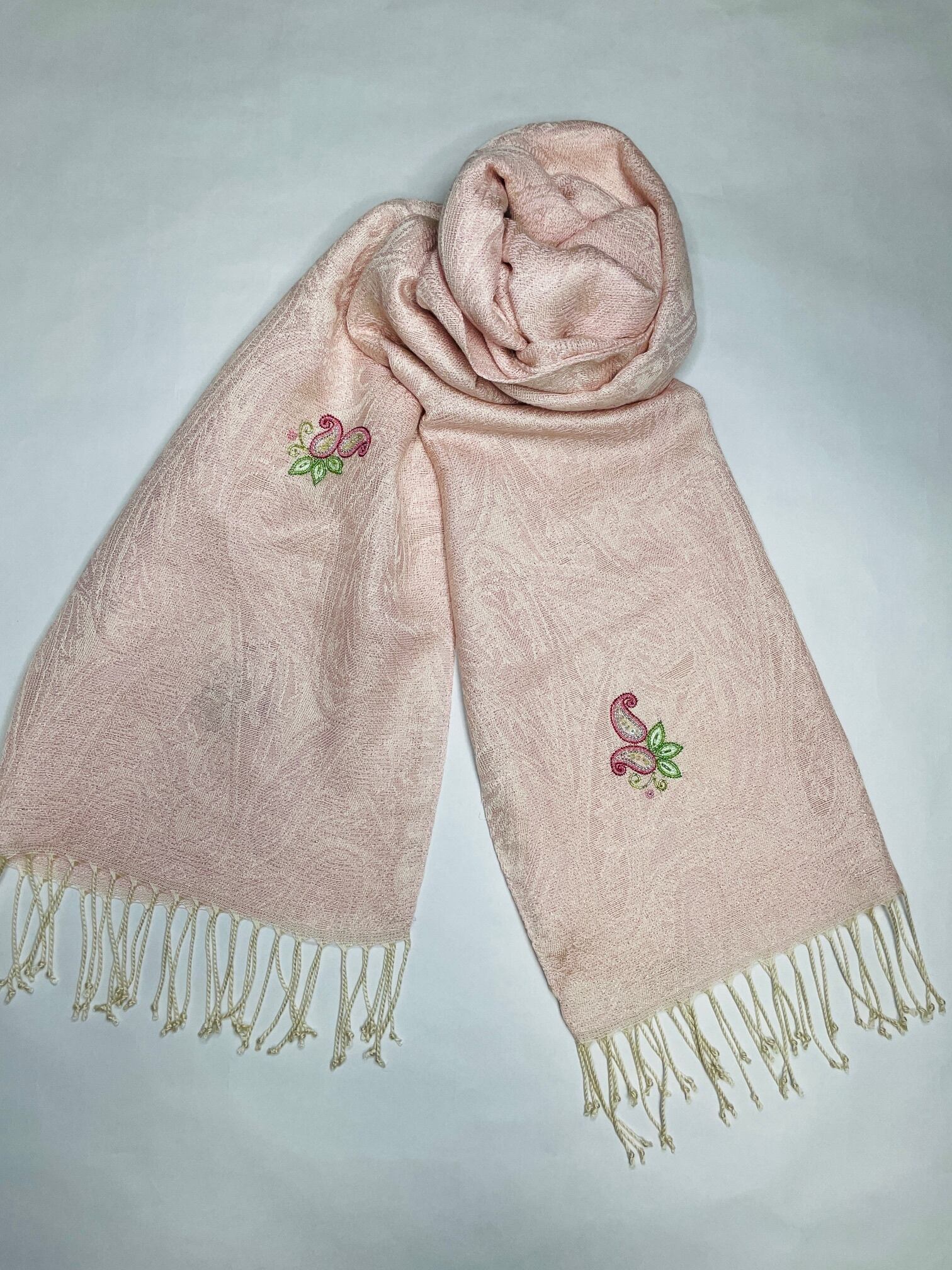 Menarikピンクのストールはペイズリー柄の生地全体に飛び柄デザインが施されています。ストールを肩にかけると、後ろにもビーズ刺繡が施してあるのでとてもエレガントです。ストールにお花をイメージしたデザインは、ピンクと緑のビーズが映えて素敵です。魅力的なストールは普段使いをはじめ、華やかなお席や特別なお出かけにお薦めです。1年を通して洋装・和装にお使いいただけますので、四季を通して様々なシーンでお楽しみ下さい。